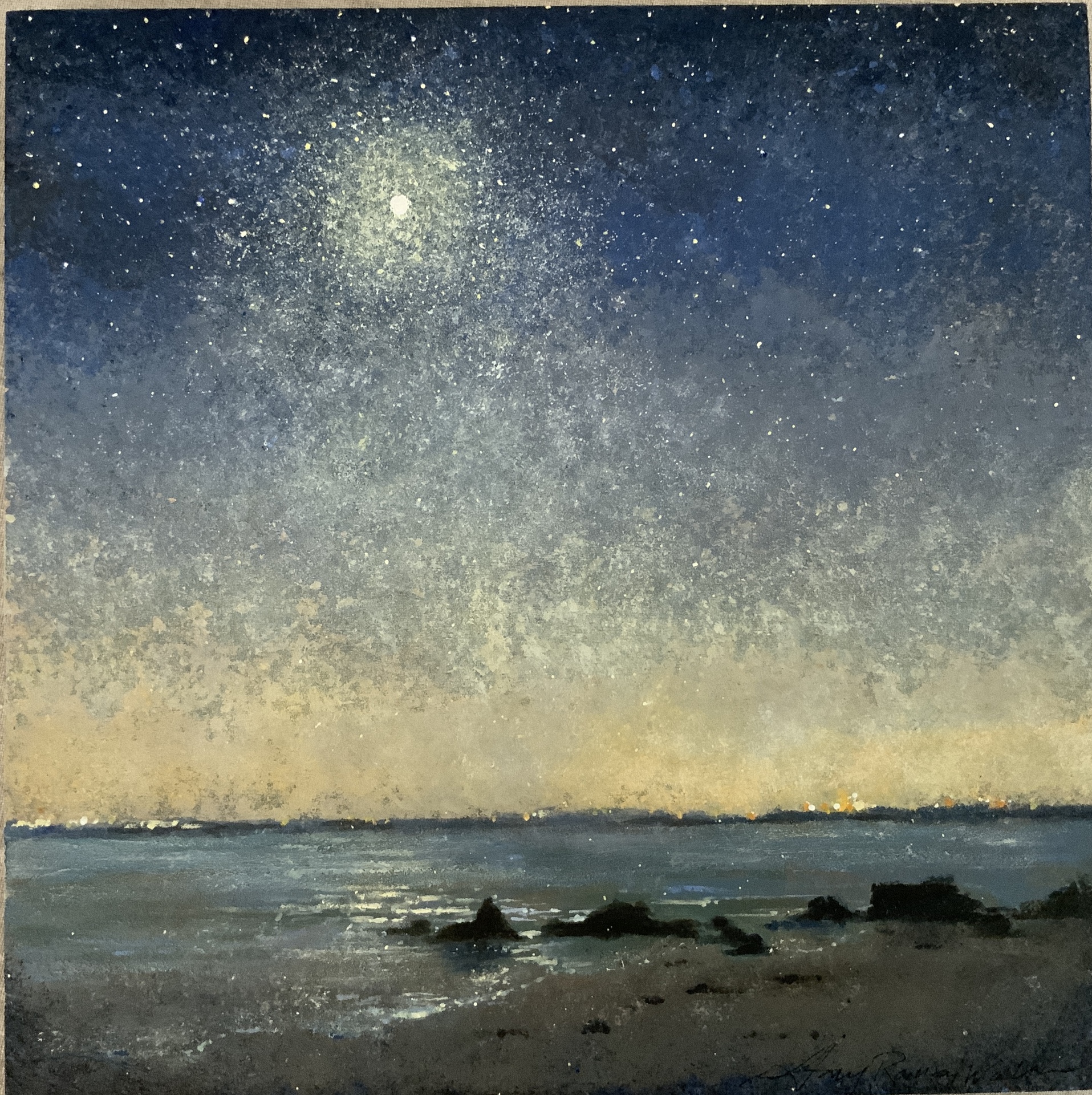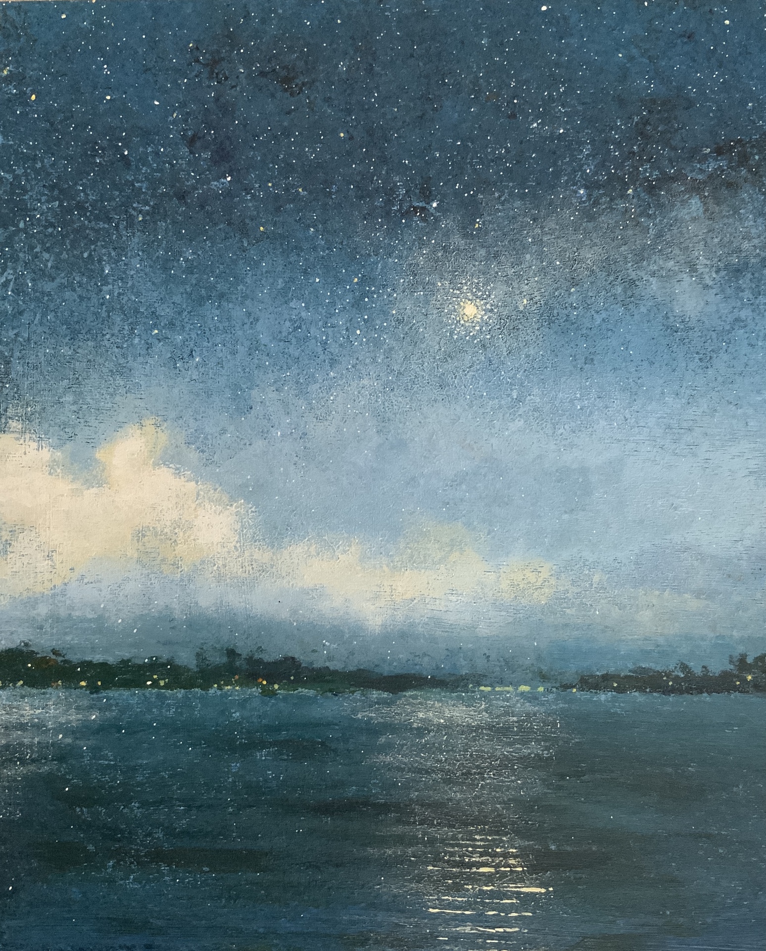 Acrylic painting of the sparkling moonlight in the evening of the water over Florida.