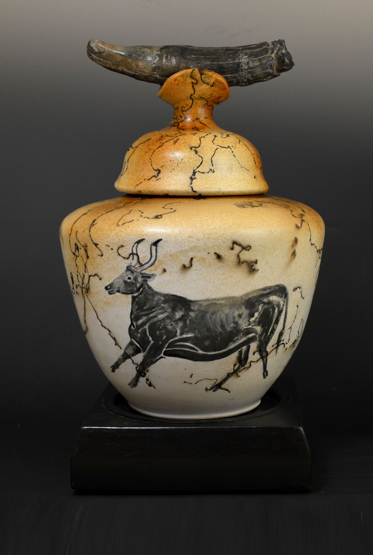 under glazed primitive motif, burnished, horse hair raku lidded vessel with fossil bone handle