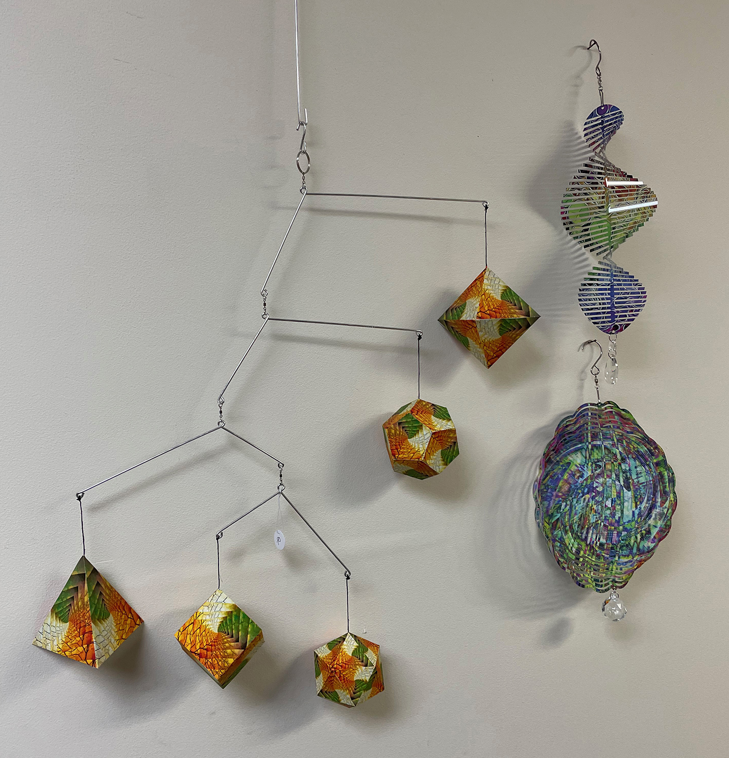 Mobiles ($75) are made out of Digital Art Prints on photo paper, shaped and hung on aluminum wires. Wind Spinners come in a variety of prints and each have a crystal prism hanging from the bottom - 12-inch Helix ($30), 10-inch Circle ($35) and 6-inch Circle ($15).