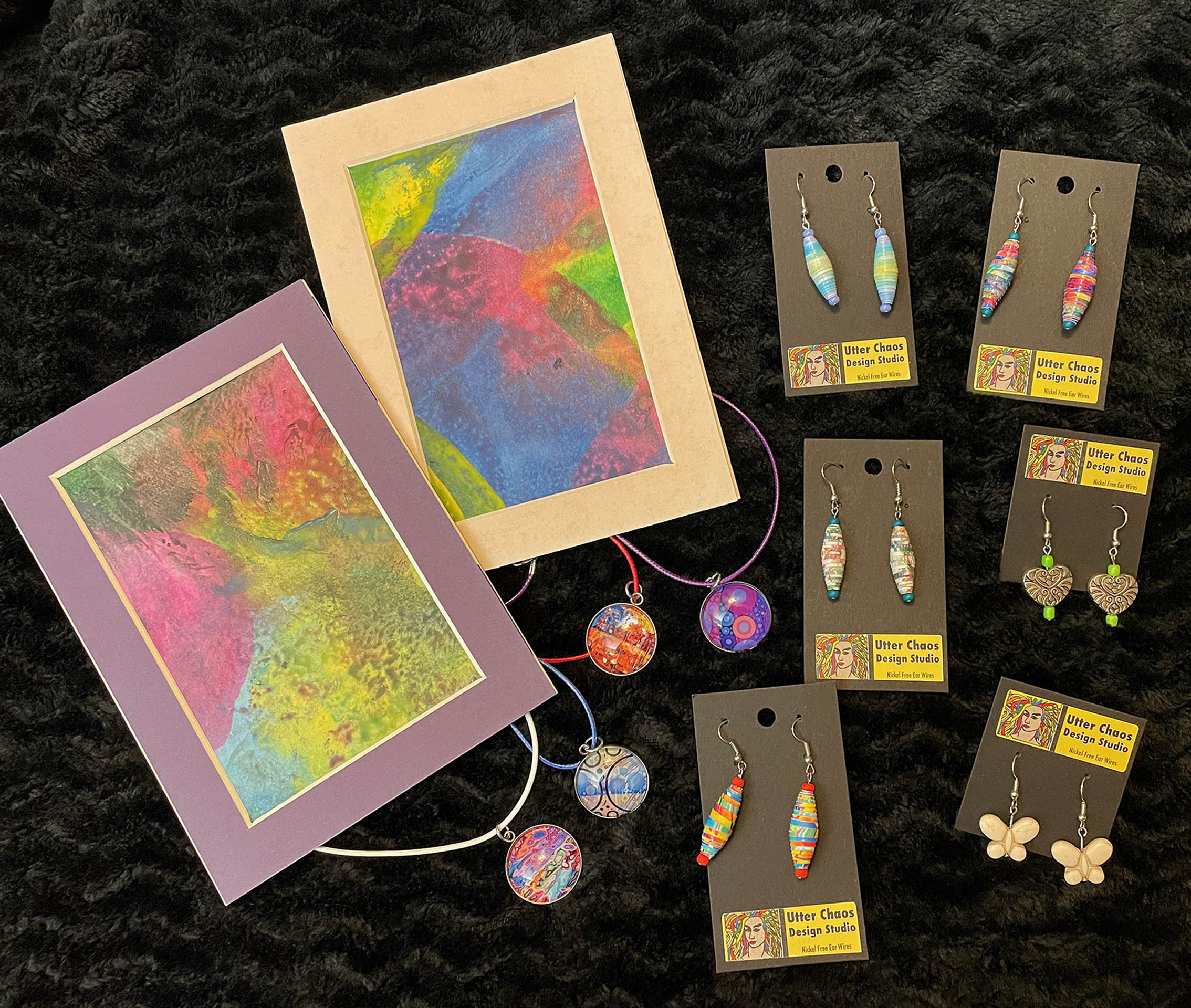 The Pendants ($10) and Custom Paper Bead Earrings ($20) are made of my digital art. The Wax Paintings ($5) are 5x7 matted. The Beaded Earrings ($10) are made from various glass, stone, and other beads.