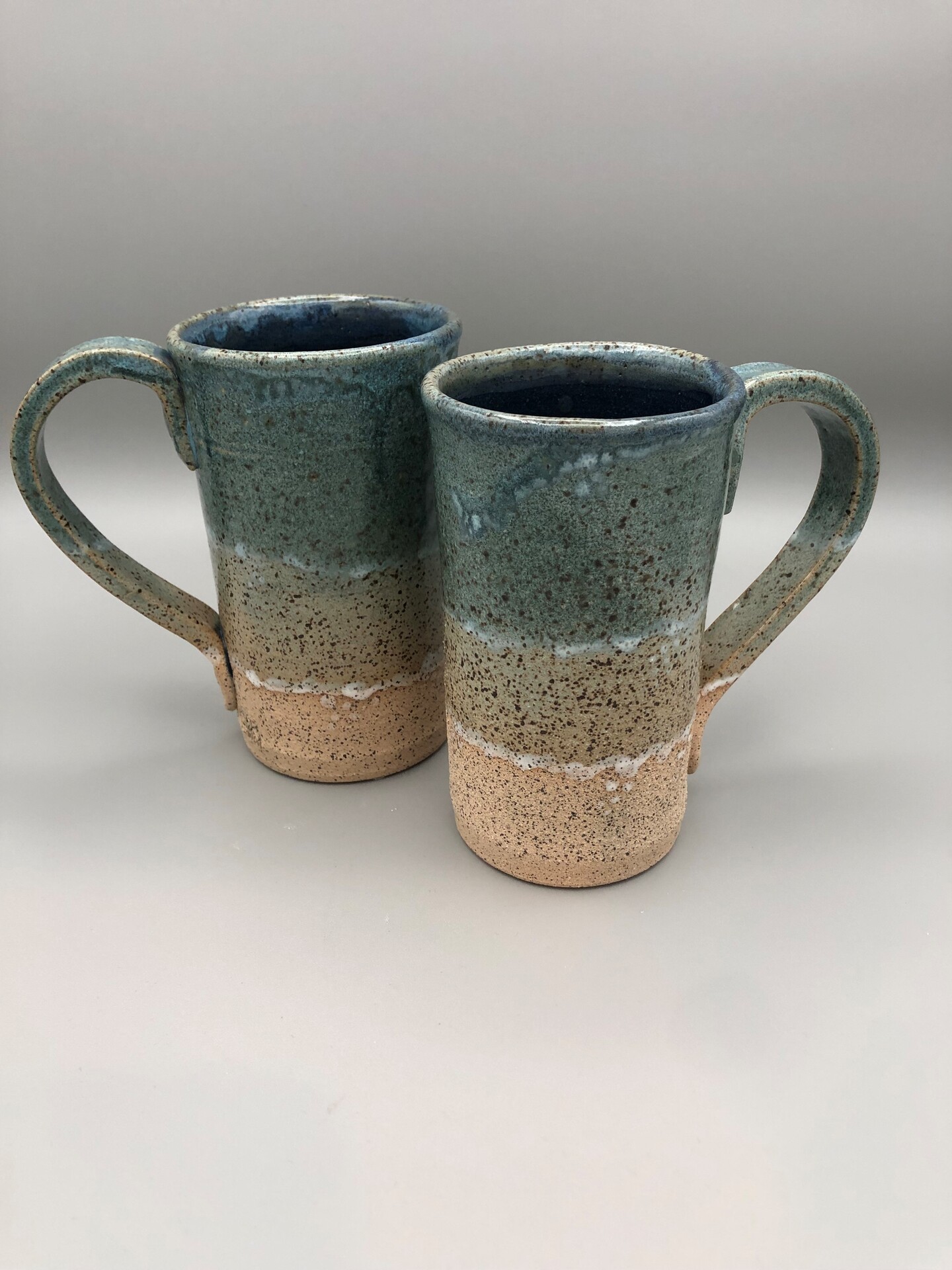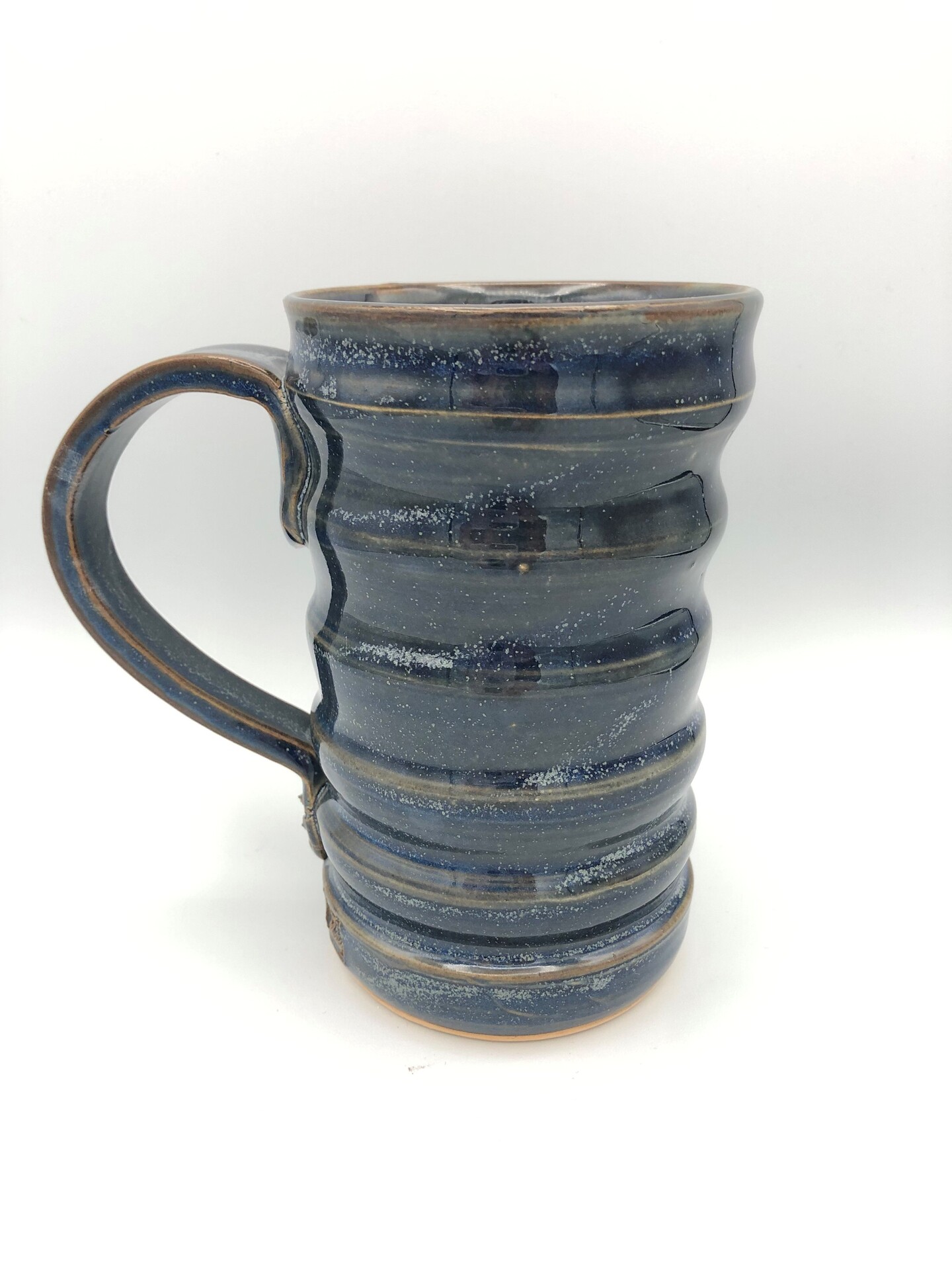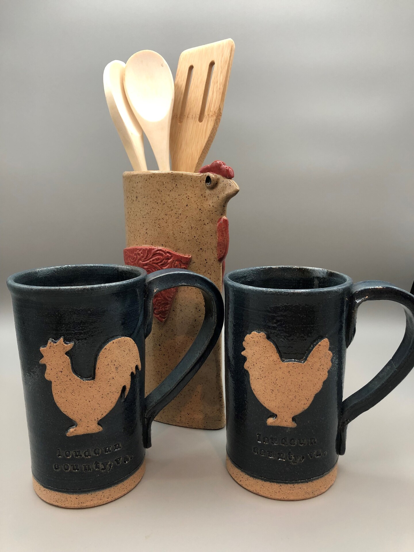 my signature "Loudoun County" mugs, crocks and ornaments for sale at Loudounberry and Roots, speckled clay and blue glaze fired to cone 5.