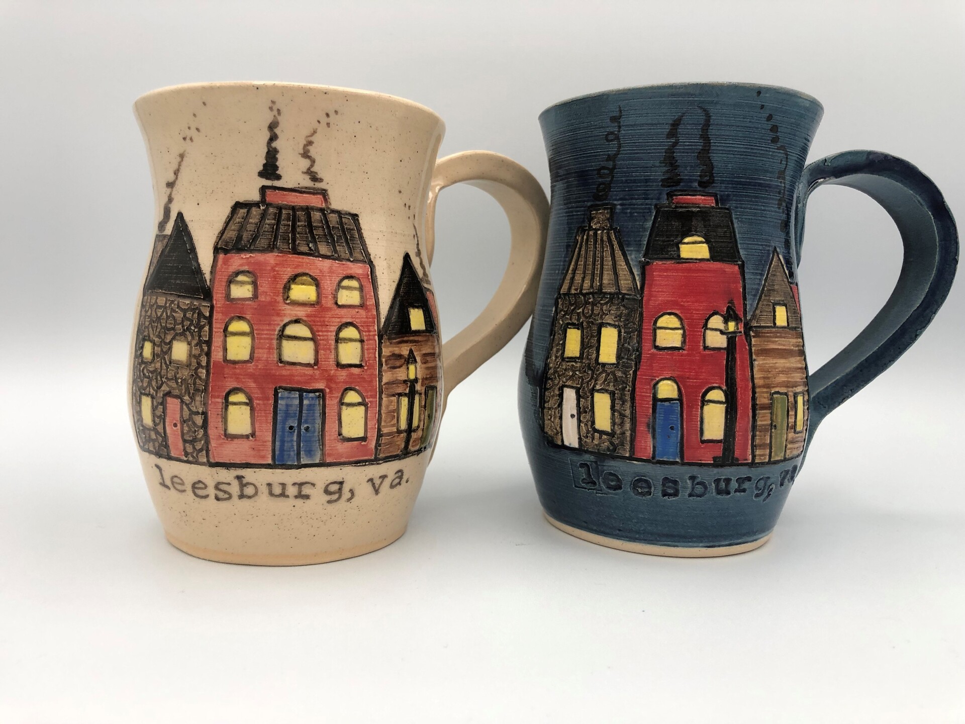 I moved to Loudoun County, VA in the mid 1990s and fell in love with what was a very rural county at the time. I visited many local potters, adding their unique mugs to my growing collection. I took lessons from potters Shawn Grove, Bryan Mattraw, and Kristen Swanson. My love of creating pottery was born. I find inspiration from the environment where I am – at the beach, in the mountains, or from memories. My beach mugs reflect my love of the ocean. The first place I lived in Loudoun County was Downtown Leesburg, which was the inspiration for my “Downtown Leesburg” mugs, ornaments, and wall hangings. Rural Loudoun County inspired me to create the “Loudoun County” mugs. My current battle with cancer has changed my perspective on making and teaching art, which is a calming and grounding therapy that can move anyone forward to recovery and hope.