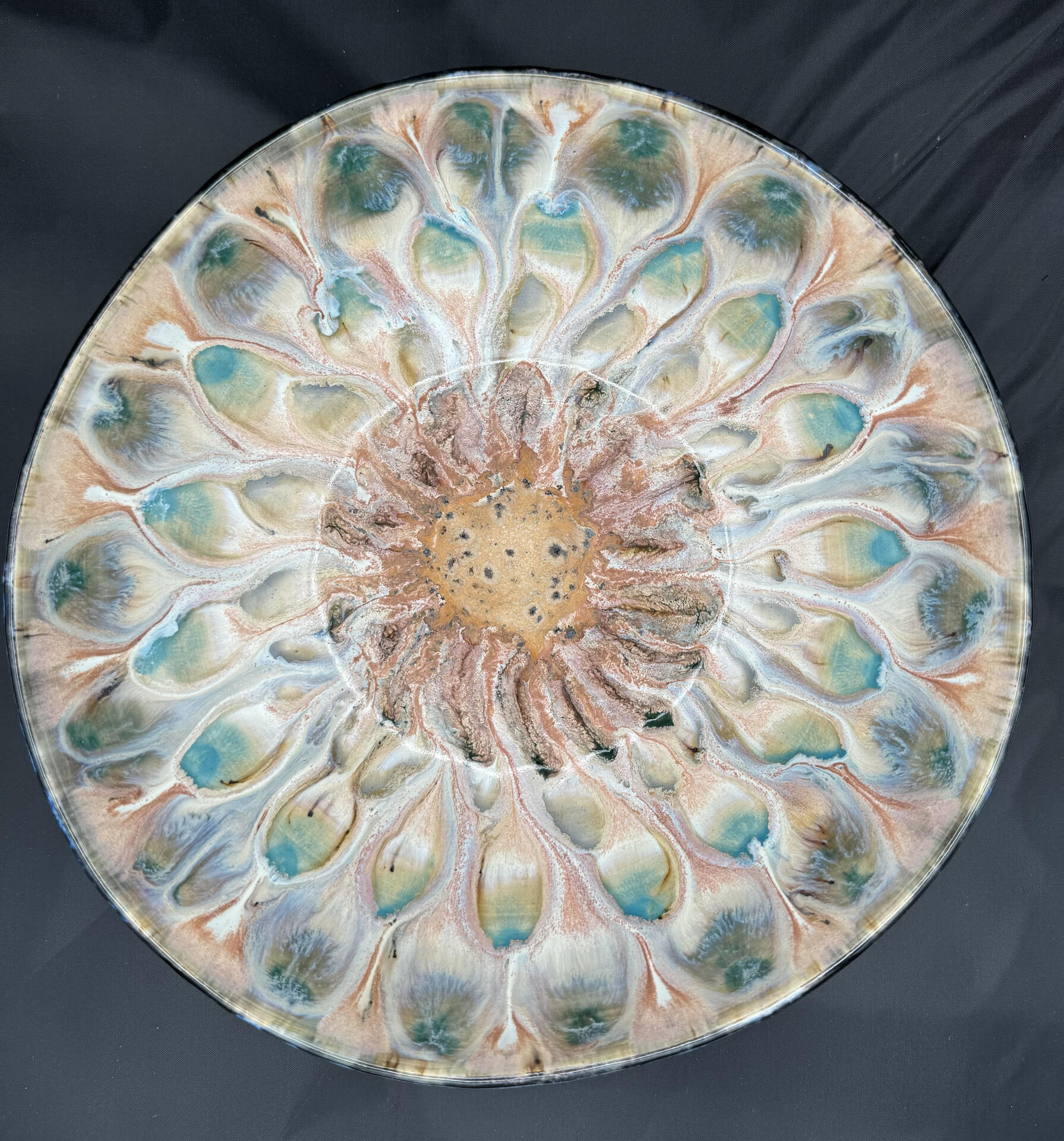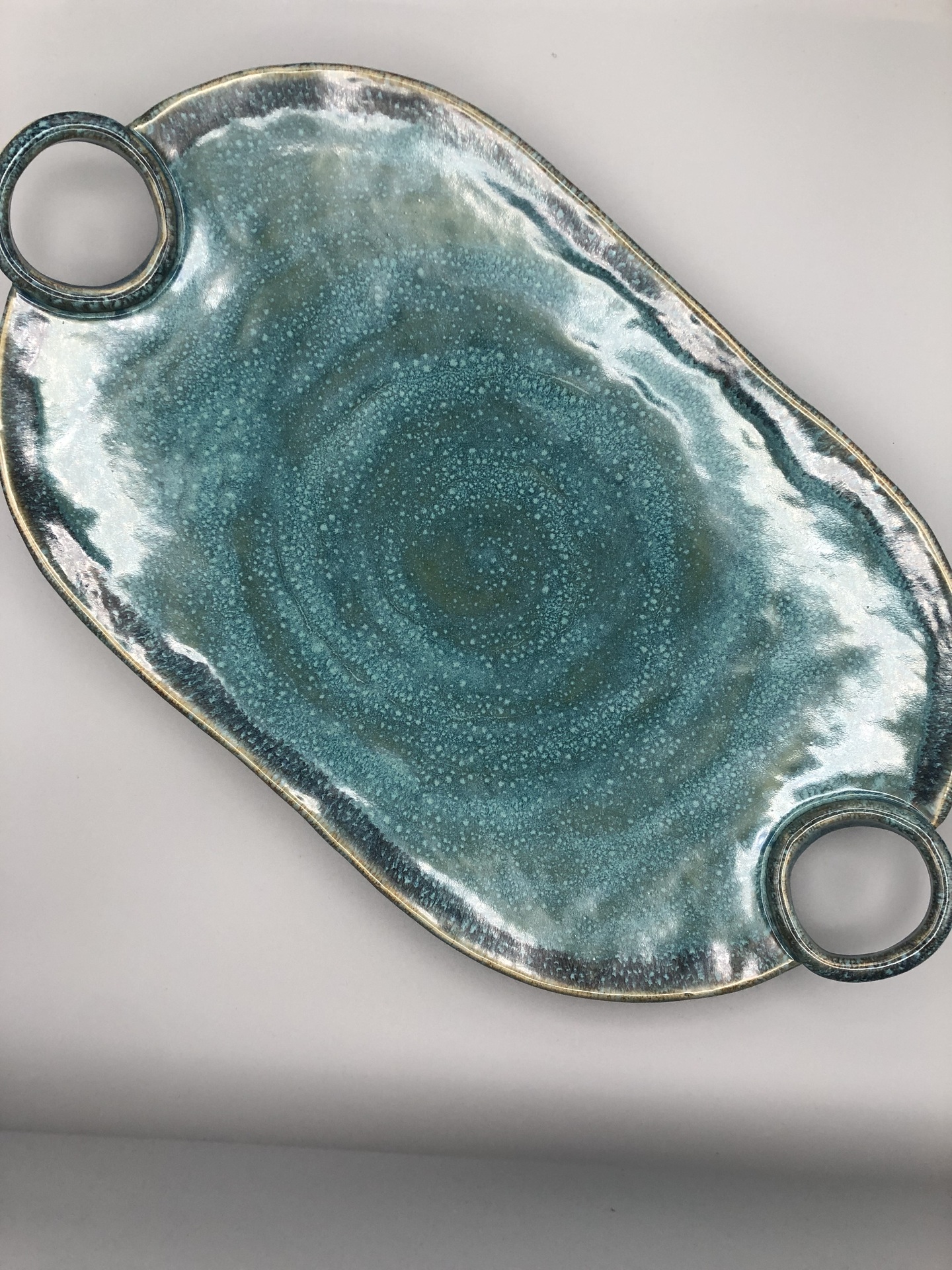 Oval serving platter with round handles, in vibrant beach colors.