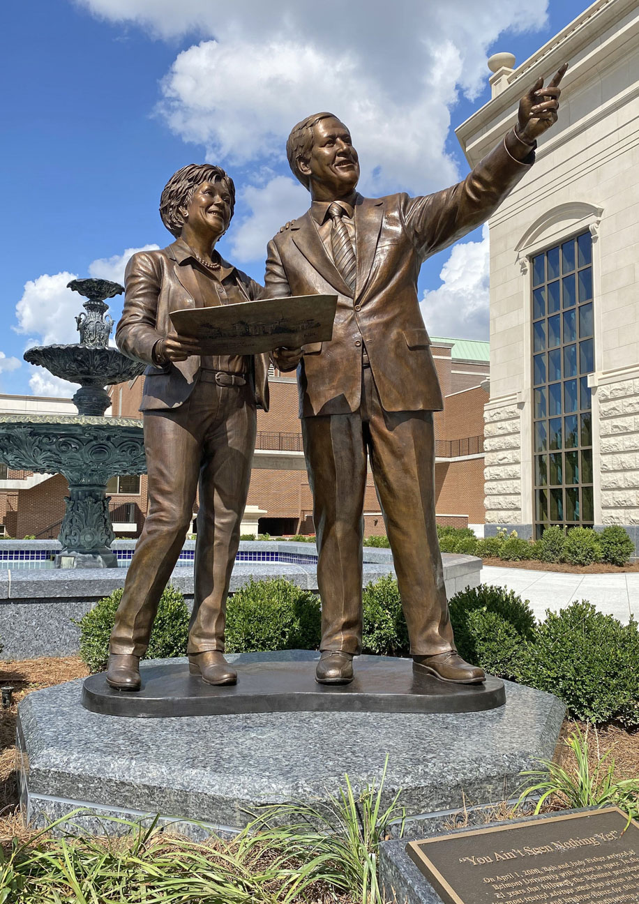 2 life size bronze high school student figures climbing a steep incline representing the uphill struggle for education