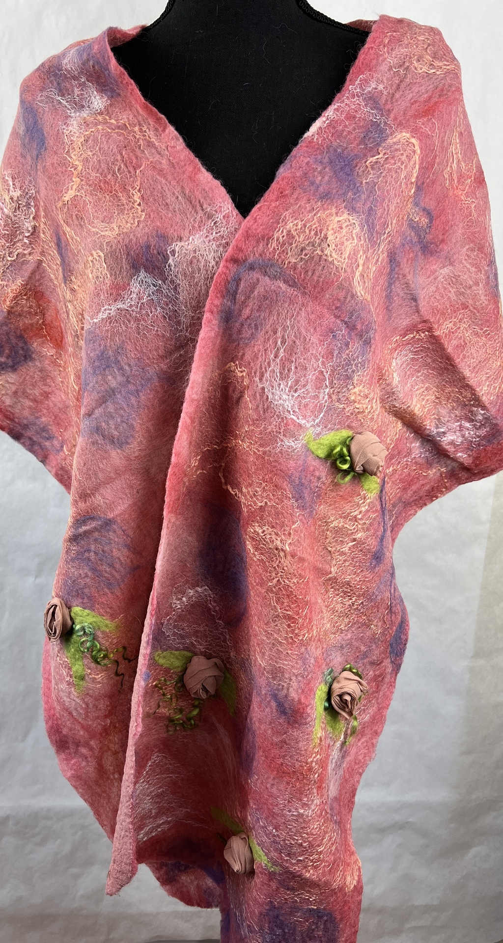 Nuno felted shawl in shades of pink and peach with silk rosettes