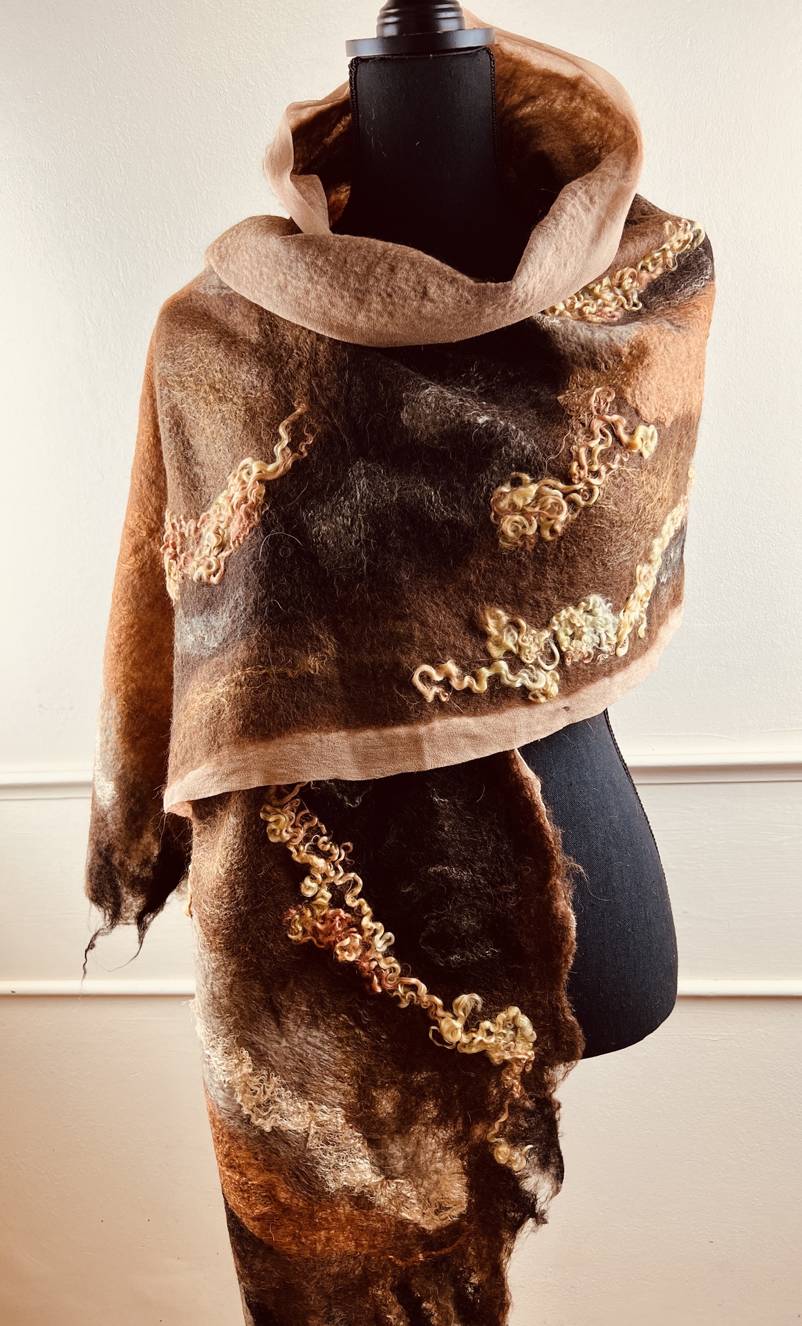 Soft, elegant Nuno felted shawl in alpaca, wool and silk.