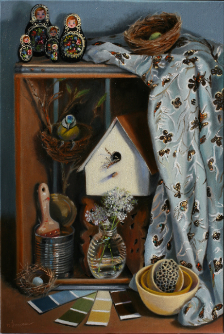 “Bold color,” confident brushstrokes,” “larger-than-life compositions” and “Wow, she can clearly paint shiny things!” have all been used to describe Dana’s paintings. Her still lifes include unconventional gatherings of common subjects. She also paints landscapes and teaches.