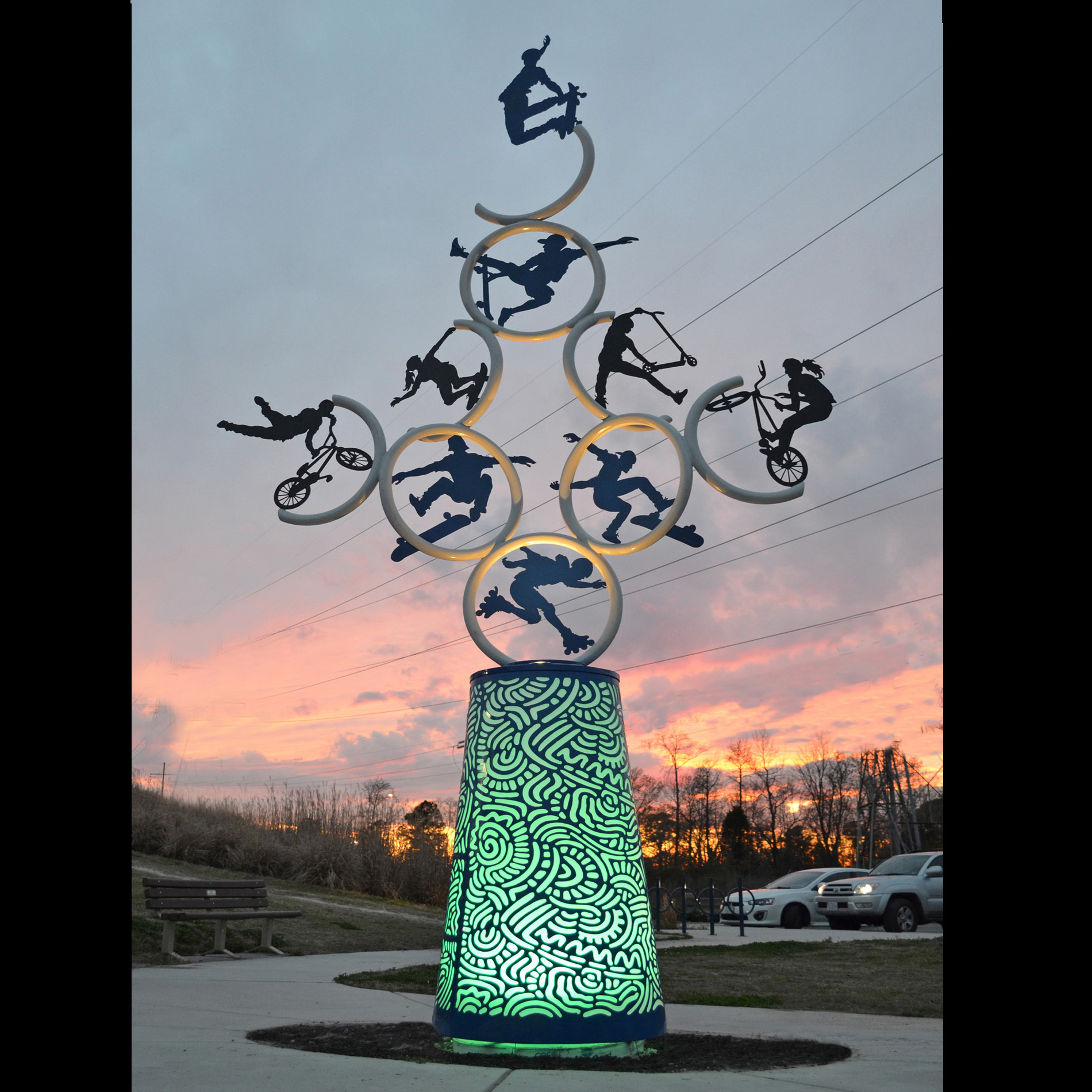Circles and half circles stacked artistically with silhouettes of boy and girl skate boarders, BMX bikes, roller blader, and push cycles doing various tricks. The base is a light that has a squiggle design cut out with white Polyethylene plastic behind. It glows in a rainbow of colors.
