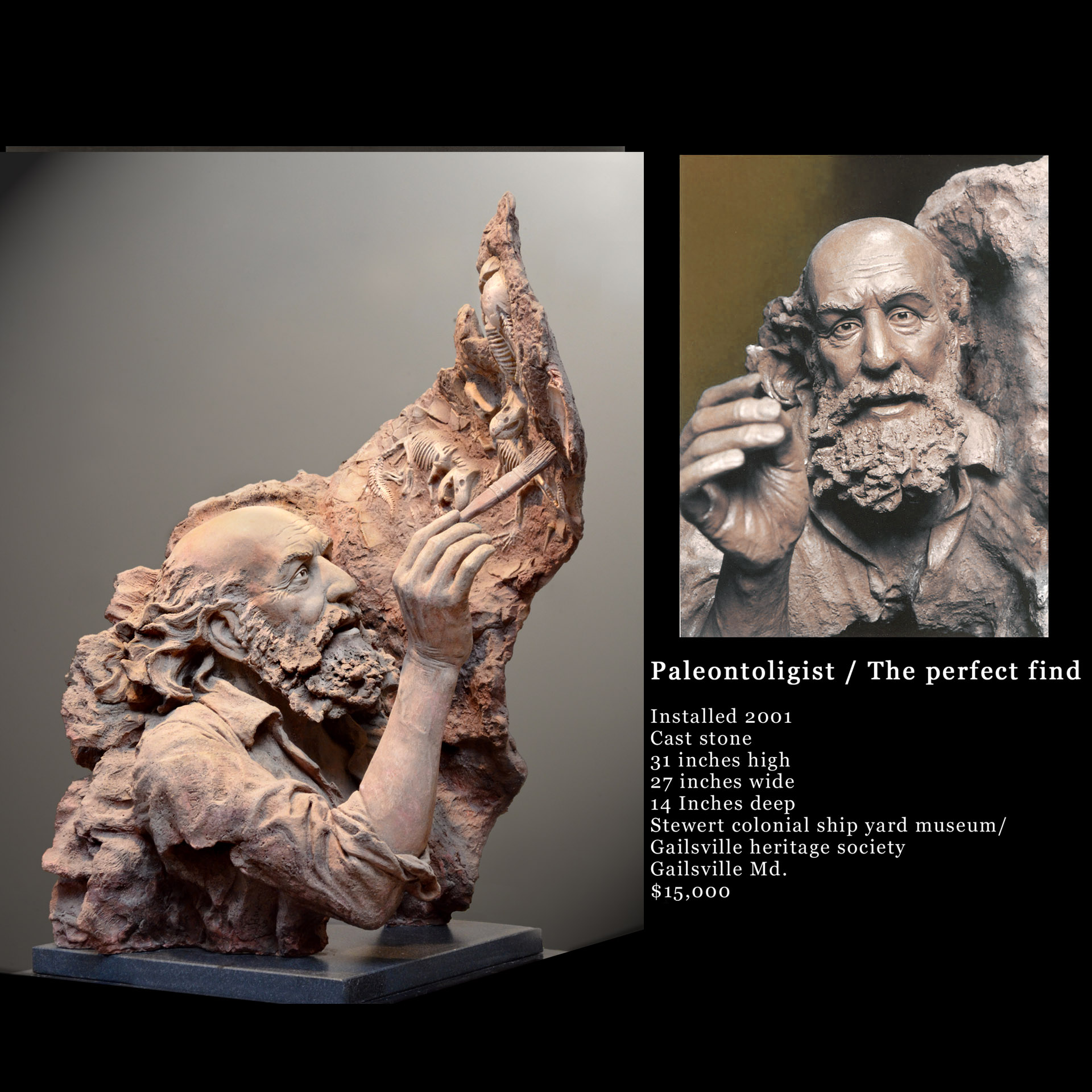 This paleontologist has discovered a perfect find. He delicately brushes aside the dust to reveal a fossilized nest of baby dinosaur bones and the egg shells. With his expression having one brow low and serious and the other brow up with excitement gives the illusion of this sculpture coming to life.