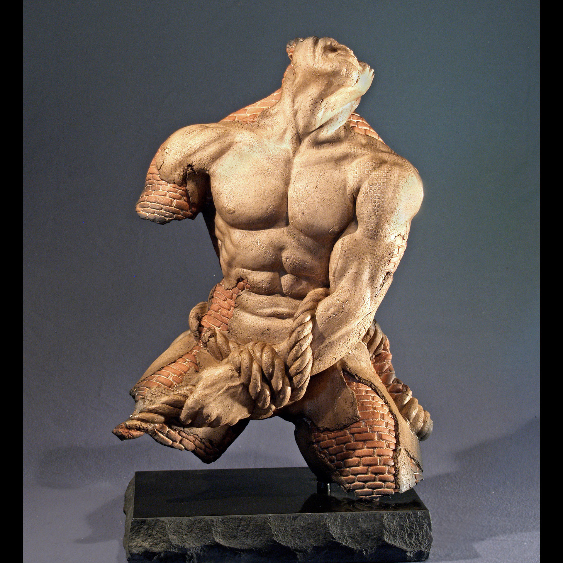 I sculpt the original figure, a plaster mold is made on the original sculpture. Slabs of textured clay with brick, lath, gears or what ever are torn and pressed in layers into the figure mold, so that each torso is different. They are multiple originals within a Limited edition of that figure form.