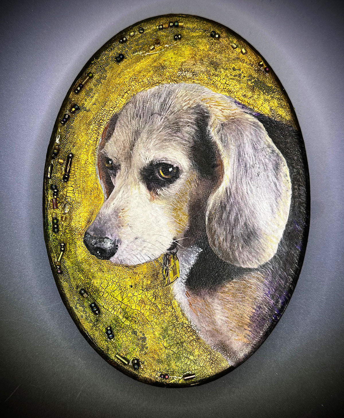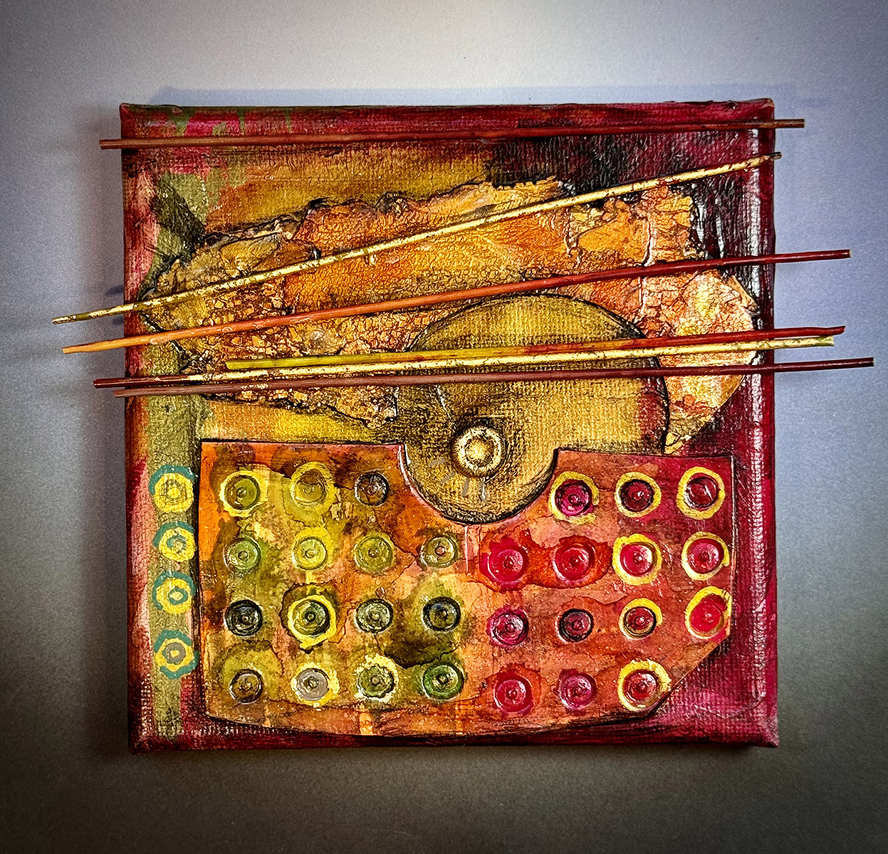 Acrylic, photography, ink pens, gold leaf, beads, polymer